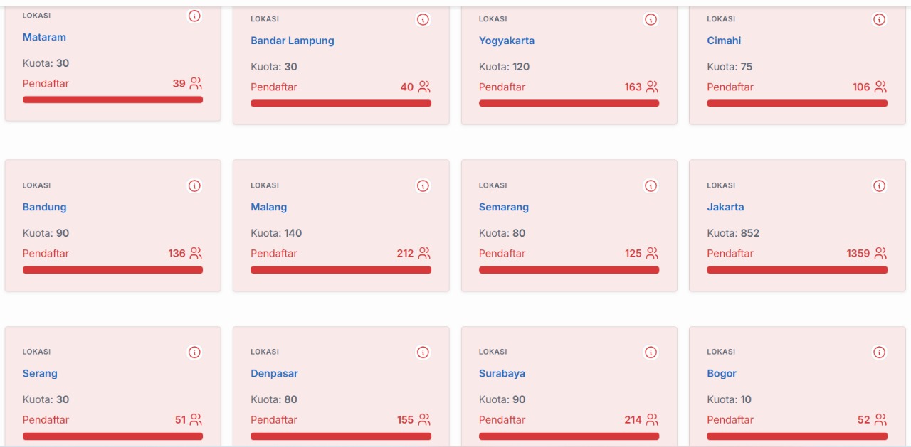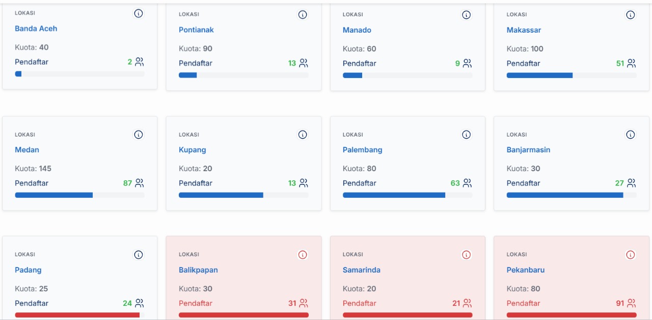 Pantau kuota kota secara aktif karena meski laman terlihat tersedia, slot bisa habis lebih cepat.